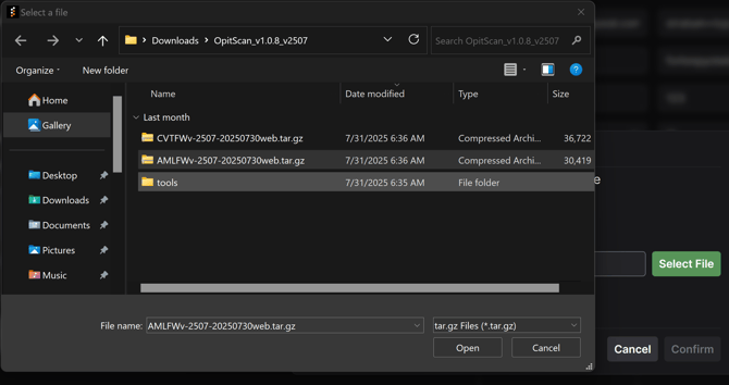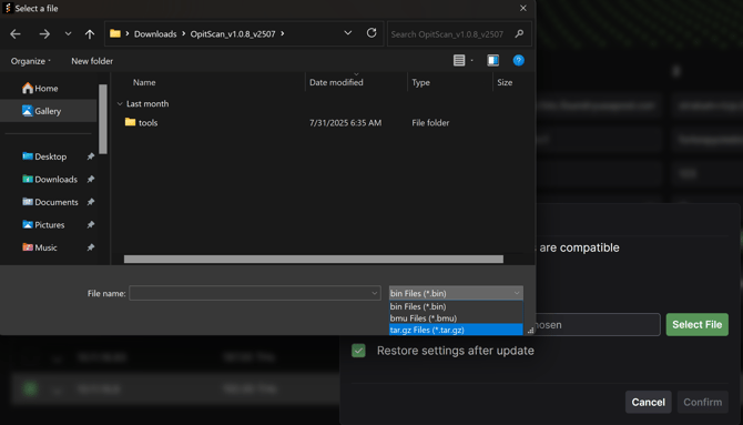 4) Then click select file. When file browsing to find your update files you need to change the file type to *.tar.gz to see the files.